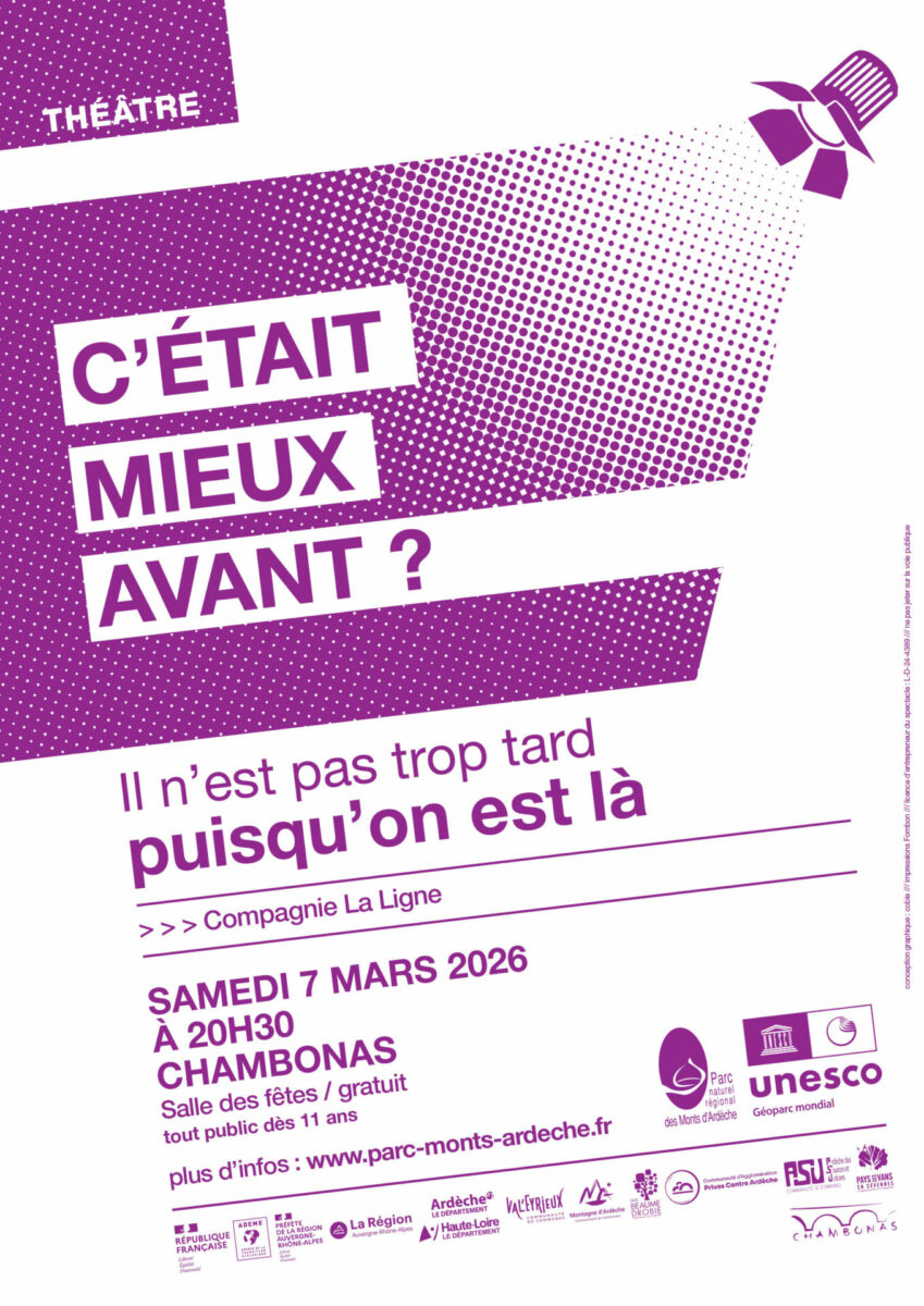 Avec le soutien de l’ADEME, la DRAC, la DREAL et six Communautés de communes dans le cadre de leur CTEAC, résidences d’artistes et programmation culturelle (Pays des Vans en Cévennes, Pays Beaume-Drobie, Ardèche des Sources et Volcans, Montagne d’Ardèche, Val’Eyrieux, Privas Centre Ardèche).